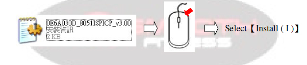 5.1.2.Entry the (2) PC-site Driver document, cursor on file 0E6A030D_8051ISPICP_v3.00 then click mouse right side and select Install ( I ).